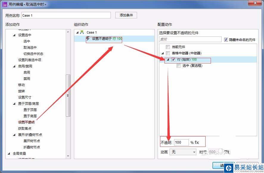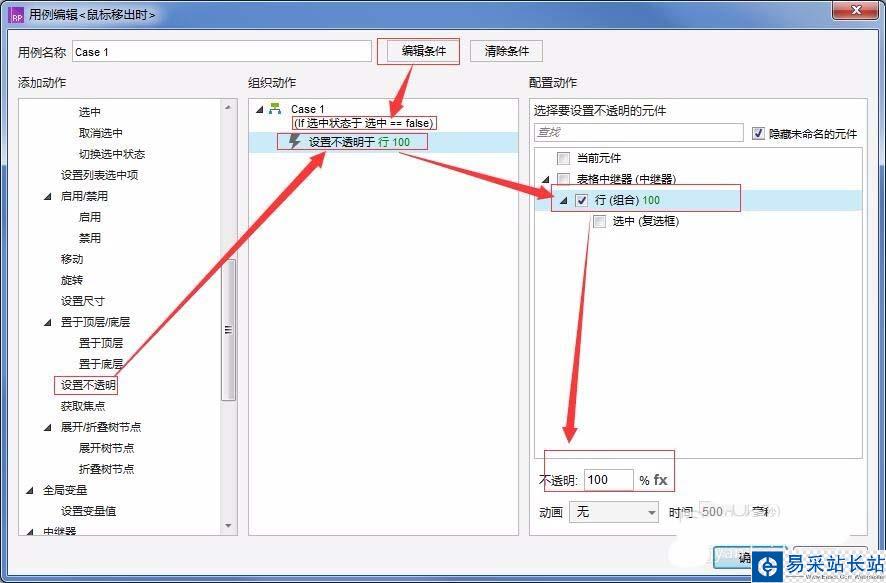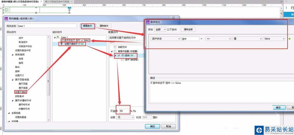 8、鼠標移入時,當復選框“選中”的“選中狀態(tài)”值==false時,“設置不透明”為"行”100%。到此時鼠標移入變色就做好了,接下來做選中變色