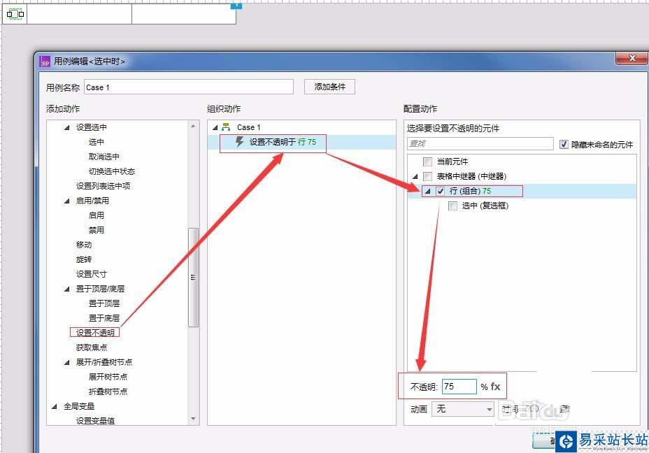 9、設置“選中”復選框“選中時”交互為 “設置不透明”“行”為75%