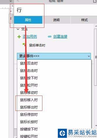 6、選中組合“行”,分別設置期鼠標移入與鼠標移出時的交互: