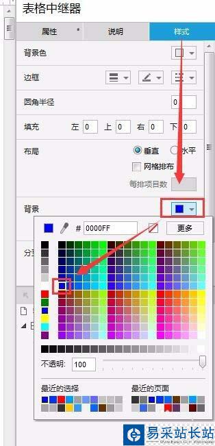 5、設置“表格中繼器”背景色為藍色(點擊中繼器空白處即可設置)