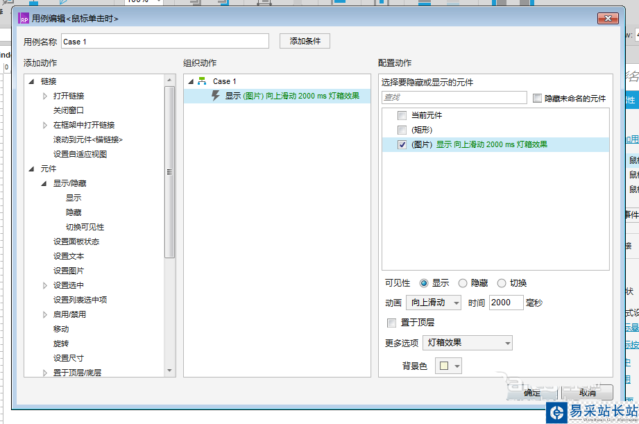 5、選中“顯示”按鈕,添加鼠標(biāo)單擊事件用例,當(dāng)圖片隱藏時(shí),點(diǎn)擊按鈕顯示出來(lái),如下圖所示: