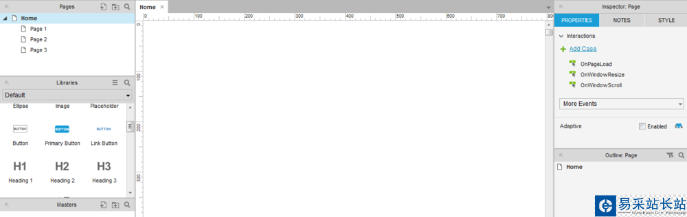 1、首先,打開Axure PR 8軟件,在Default中找到Button,拖出四個按鈕到Home頁面,從左到右依次排列,水平坐標一致,如下圖所示: