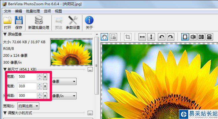 3、使用PhotoZoom打開圖片后我們可以在左側直接輸入照片的尺寸和分辨率,在寬高比中還可以選擇拉伸或剪切。