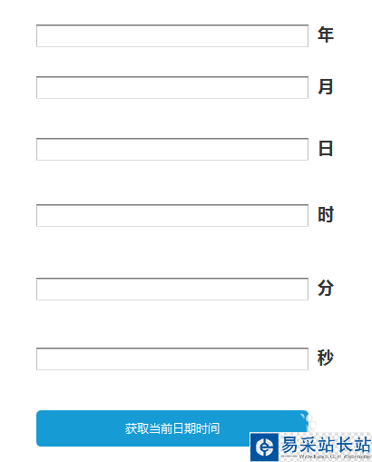 2、六個(gè)輸入框后依此添加三級(jí)標(biāo)題,分別改為年、月、日、時(shí)、分和秒,按鈕的內(nèi)容改為“獲取當(dāng)前日期時(shí)間”,如下圖所示: