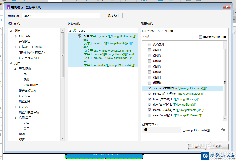 4、選中“獲取當(dāng)前日期時(shí)間”按鈕,添加鼠標(biāo)單擊時(shí)的用例,分別給年月日時(shí)分秒分別綁定函數(shù),如下圖所示: