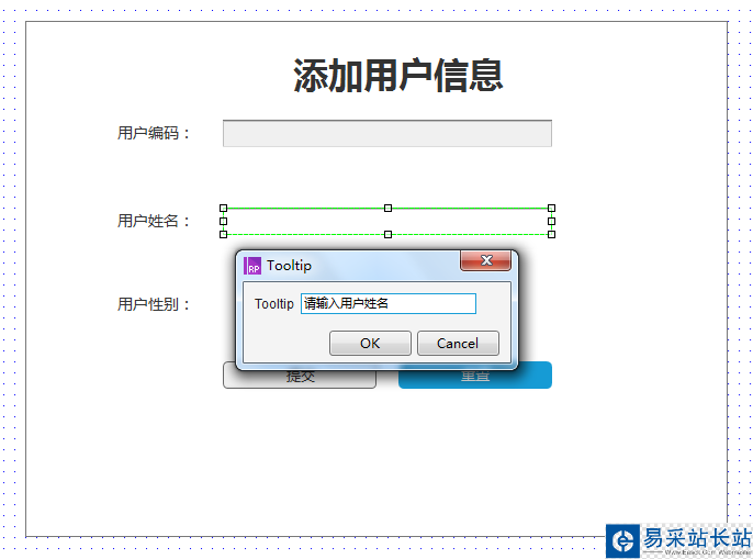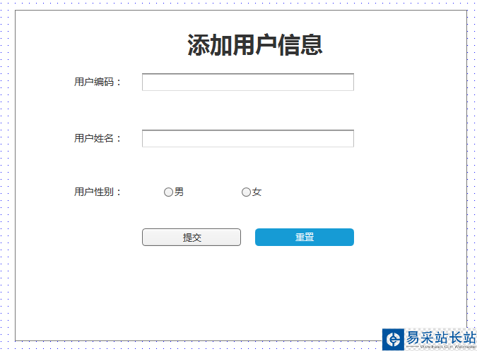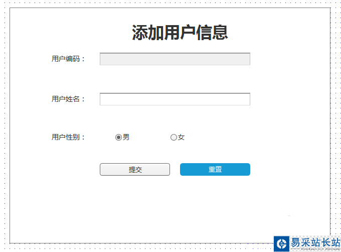 5、由于用戶編號是自動生成的,可以利用禁用功能,用戶姓名加了提示,性別默認顯示“男”,如下圖所示: