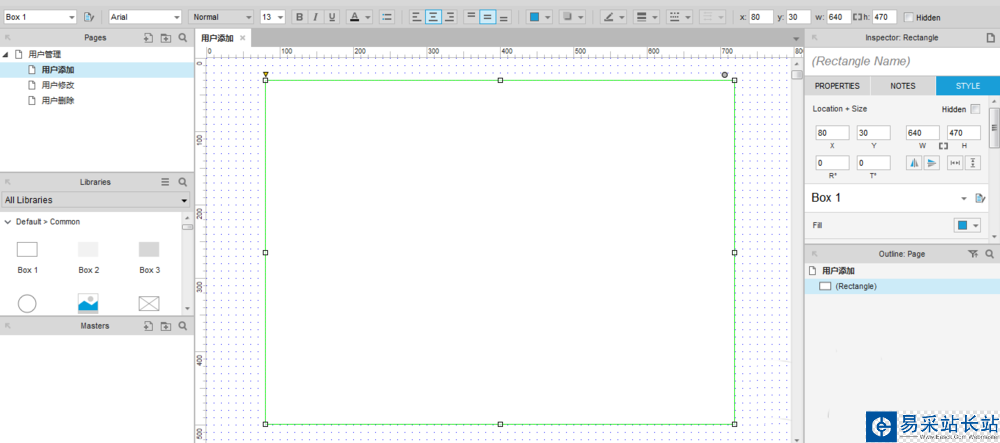 3、在面板中拖曳一個“Box1”控件到編輯窗口,改變該控件寬度和高度,如下圖所示: