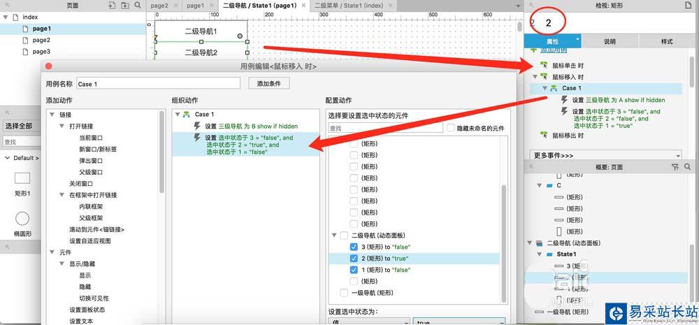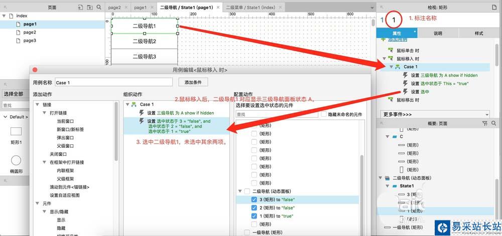 3、添加二級導航菜單中三個選項的交互用例,如圖操作,第二張和第三張與第一張的邏輯是一樣的,COPY設計就可以了。