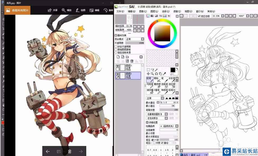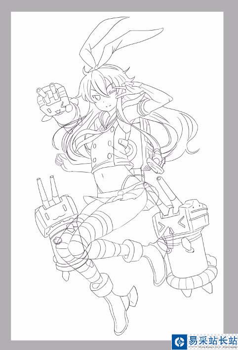 2、在網(wǎng)上找到一張艦娘島風的圖片,參照此圖片,在sai中新建圖層,用鉛筆工具繪畫出大體形態(tài)。