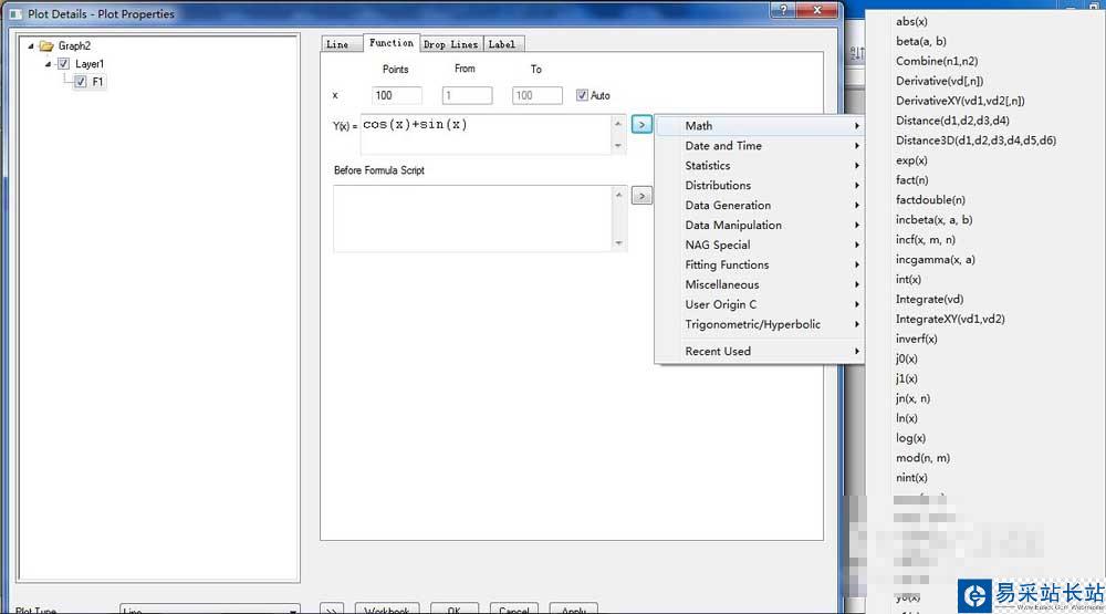 3、在Plot Details對(duì)話框中可以選擇各種數(shù)學(xué)函數(shù)和統(tǒng)計(jì)分析函數(shù)。在選擇函數(shù)后,單擊OK既可在繪圖窗口中生成圖形。也可以使用Origin的自編輯函數(shù),本例定義了一個(gè)“cos(x)+sin(x)”函數(shù),如圖所示。