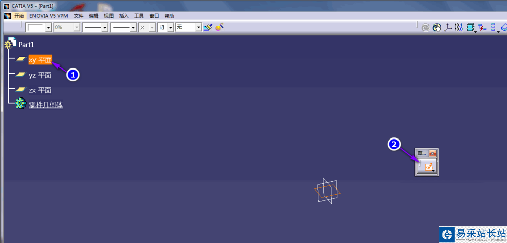 1、首先讓我們來打開CATIA軟件,進入零件設計模塊,在左上角樹形結構圖或者在視圖區選擇xy平面,單擊草圖命令進入草圖界面;
