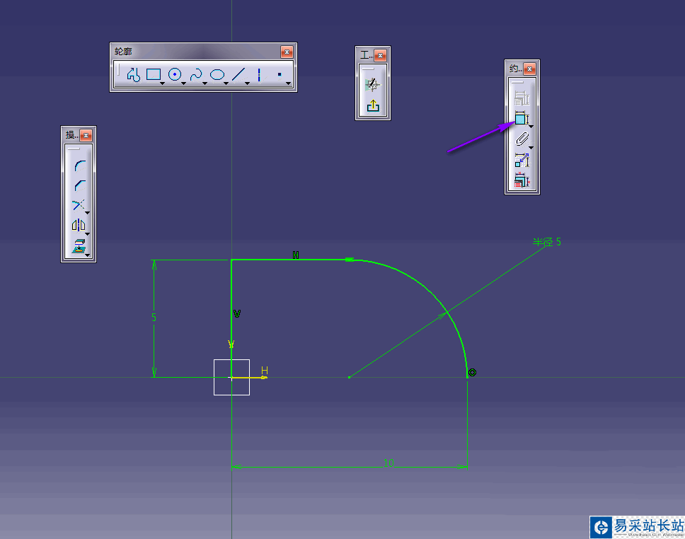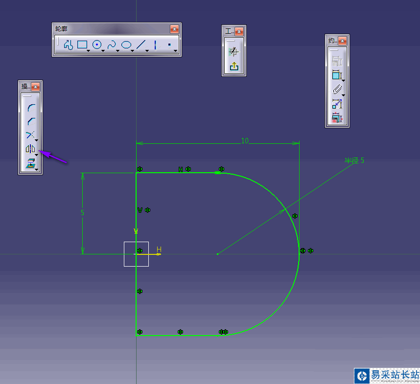 3、單擊約束命令,對視圖中的多線段進行全約束,當視圖中的多線段顏色顯示為全綠色時說明草圖已經被全約束了;