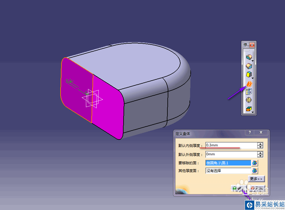 7、繼續選擇盒體命令,對實體進行抽殼操作,在命令對話框中設置抽殼的厚度為0.3mm,并在視圖區選擇要移除的面,單擊確定完成所有操作,這樣我們就完成了對一個簡單三維實體的創建工作。