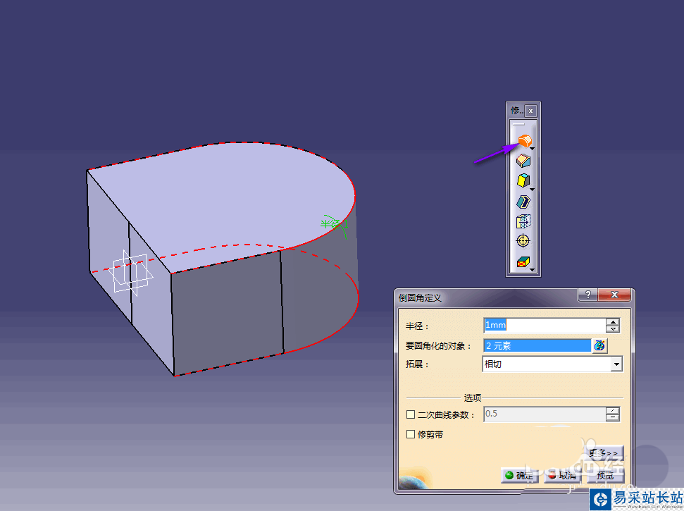 6、單擊倒圓角命令,并將圓角定義為1mm,選擇要圓角化的邊線為圖示兩條邊線,單擊預覽并確定;