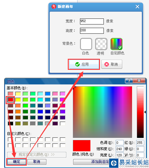 1、打開美圖秀秀軟件,新建畫布設置寬度952x高度200的像素,點擊自定義顔色。