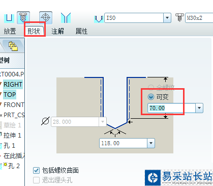 1、新建孔特征,系統(tǒng)彈出如下圖所示“孔”的操控面板,選取“創(chuàng)建標準孔”按鈕(下圖中左上角小方框內(nèi)),放置處選取上表面,偏移參照選取兩個基準面且偏移距離都為50,定義好孔M30x2和孔深80。