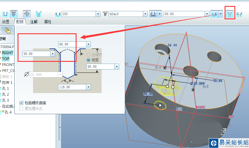 簡單孔只需定義孔的位置、直徑和深度即可,方法如下。