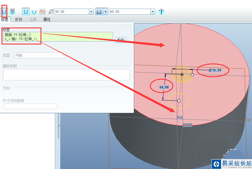 2、系統(tǒng)彈出如下圖所示“孔”的操控面板,選取“創(chuàng)建簡單孔”按鈕(下圖中左上角小方框內(nèi)),放置處按Ctrl鍵選取上表面和中心軸,定義好孔的直徑30和深度60。