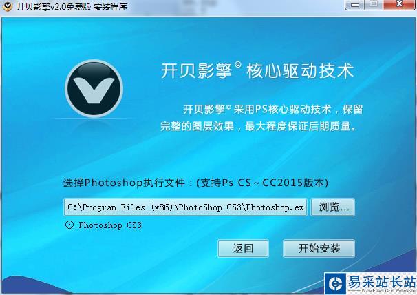 4、選擇Photoshop執行文件的所在路徑,由于該軟件需要Photoshop的支持,若無可點擊此處下載:photoshop cc 2018中文破解版,這里程序會自動檢測用戶的電腦上有哪個版本的Photoshop,之后會在下方顯示,用戶只需勾選即可