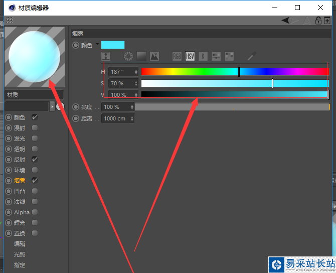 4、在顏色屬性中,選擇改變顏色,請注意預(yù)覽器的變化,在此說明一下,顏色屬性上的顏色是最底層,而煙霧屬性的顏色有優(yōu)先級;