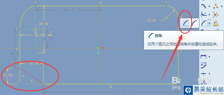 5、倒角修剪。倒角修剪的操作方法如下圖,尺寸僅供參考,其與第4步的區別在于倒角后不保留構造線。