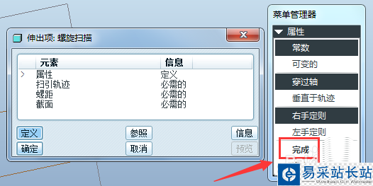 2、系統(tǒng)彈出如下的“伸出項(xiàng):螺旋掃描”對話框和“屬性”的菜單管理器,選擇默認(rèn)值“常數(shù)”、“穿過軸”和“右手定則”,點(diǎn)擊“完成”。