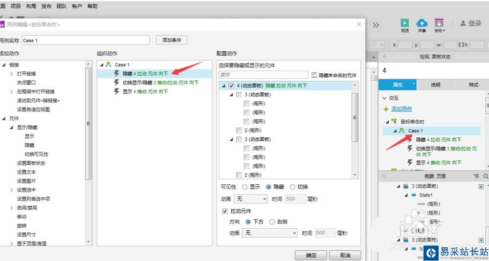7、雙擊動態面板“4”,再雙擊第一個狀態“State1”,繼續為二級菜單元件的【鼠標單擊時】添加動作。我們先添加【隱藏】外層動態面板“4”的動作,并且勾選【拉動元件】的選項。