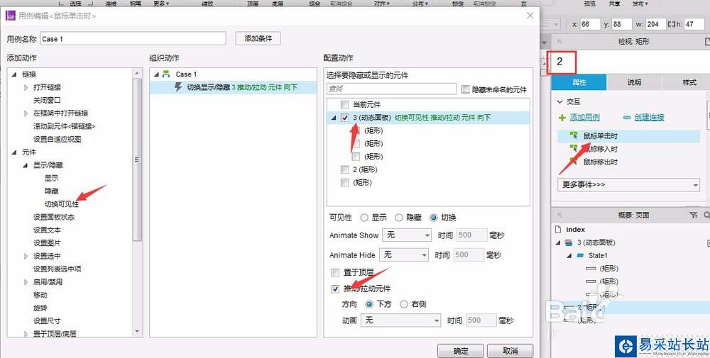 4、二級菜單元件的【鼠標單擊時】添加用例,設置動作為【切換可見性】,勾選目標元件“3”,并且勾選設置中的【推動/拉動元件】。