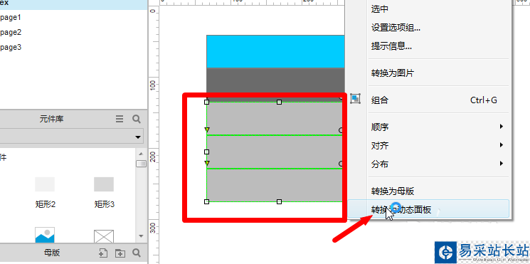 2、我們把三級菜單的三個元件全選,在上面點擊鼠標右鍵,選擇【轉換為動態面板】的選項。