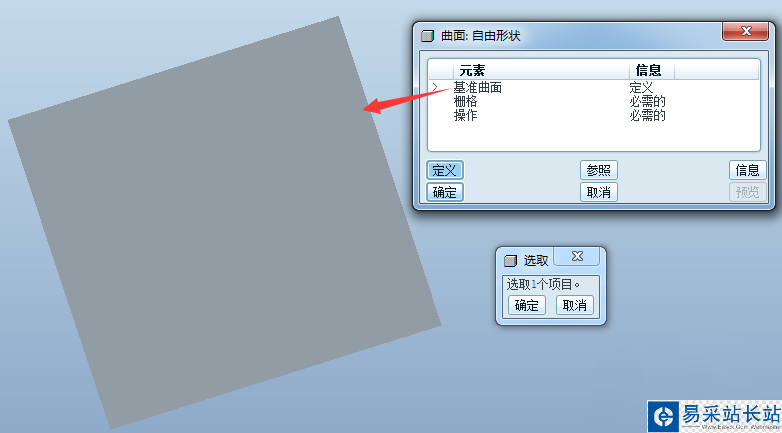 3、彈出如下的“曲面:自由形狀”對話框,基準曲面選取上述平面。