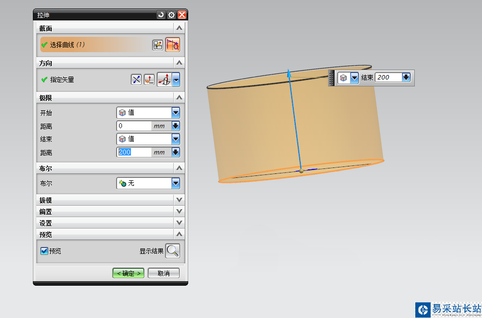 2、退出草圖,點擊拉伸,把圓形先拉伸成一個圓柱體,高度設置為200。