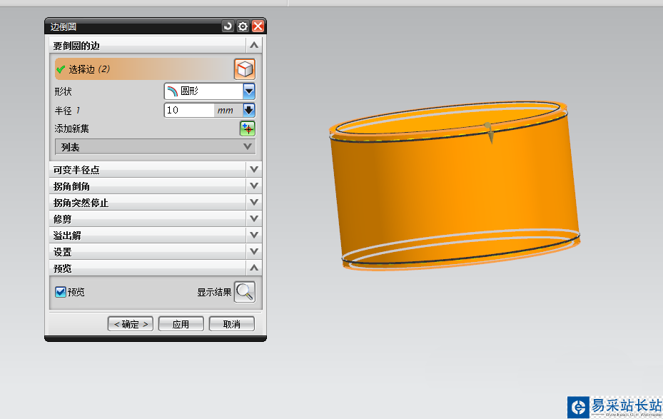 4、點擊【邊倒圓】,選擇要倒圓角的邊,這里我們選擇上、下兩條邊,設置倒圓角的半徑為10即可。
