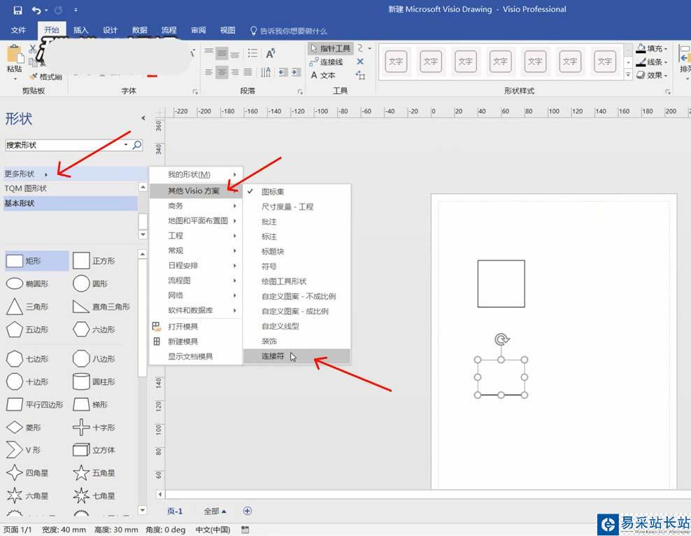 2、點(diǎn)擊“更多形狀”,點(diǎn)擊“其他Visio方案”—“連接符”。