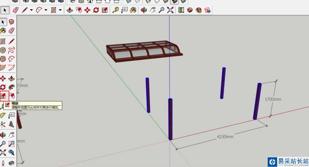 3、選擇四根立柱,然后選擇縮放工具,這時四根立柱就像一個整體,出現九個控制點,我們用縮放工具選擇正中間的一個控制點。然后往上拉伸一點點,松開鼠標在右下角的數值框輸入2000mm,按鍵盤上的回車鍵,(輸入的數值一定要帶單位,否則圖形會以倍數縮放),此時四根立柱的高度如圖所示,