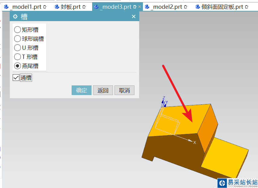 4選用鍵槽命令,選用”燕尾槽“并激活”通槽“;具體參數如圖所示,得到一個在該斜面的中間開出的燕尾槽。
