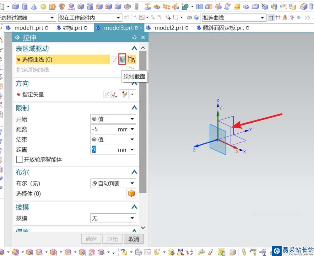 1、新建建模文件,該零件的主體可直接通過拉伸得到;選用拉伸,以XZ面為草圖平面進行截面線的繪制。