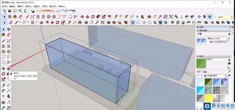 4、此時我們可以選中圖塊的某個單位,在Sketchup左側工具欄中點擊拖/拉工具,即可選中某一個面進行拖拽。