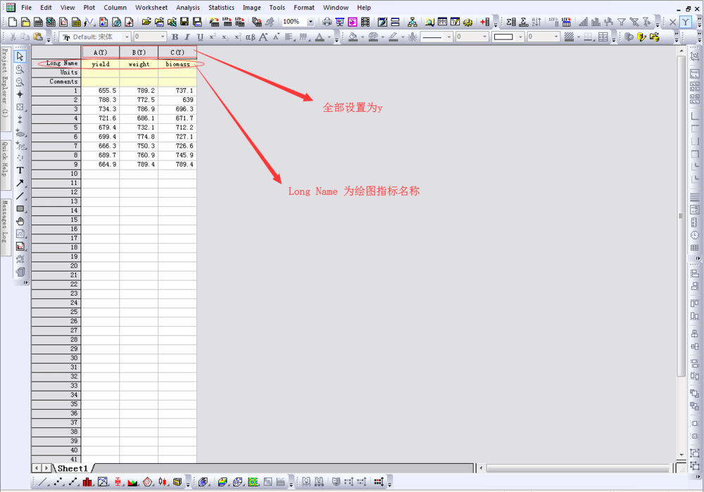 導入數據。例如,經試驗獲得三組數據,分別代表三個指標,要求繪制箱線圖。如圖所示,將數據導入origin的workbook,并將三列數據都設置為y(選中該列數據,右擊,在彈出的快捷菜單中選擇【Set as】-【Y】),【Long name】行分別為指標的名字。