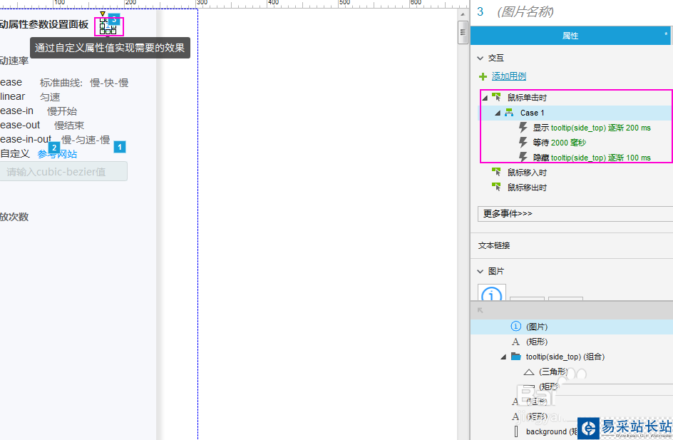 8、回到接受單擊動(dòng)作的元件的交互屬性看一下,相當(dāng)于通過(guò)三個(gè)時(shí)間來(lái)實(shí)現(xiàn)【隱藏-單擊顯示-2s后消失】的效果