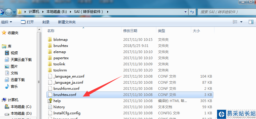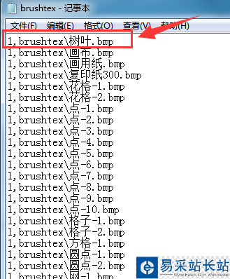 5、在我的電腦里找到這個brushtex文件夾打開,找到brushtex.conf文件用筆記本打開,按照上面的格式加上剛才我們存的樹葉文件,如圖所示: