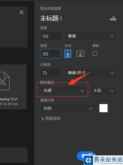 2、打開PS,新建一個512*512像素大小的灰度文檔,只有這個大小的沒有顏色文檔才是材質紋理的文件。