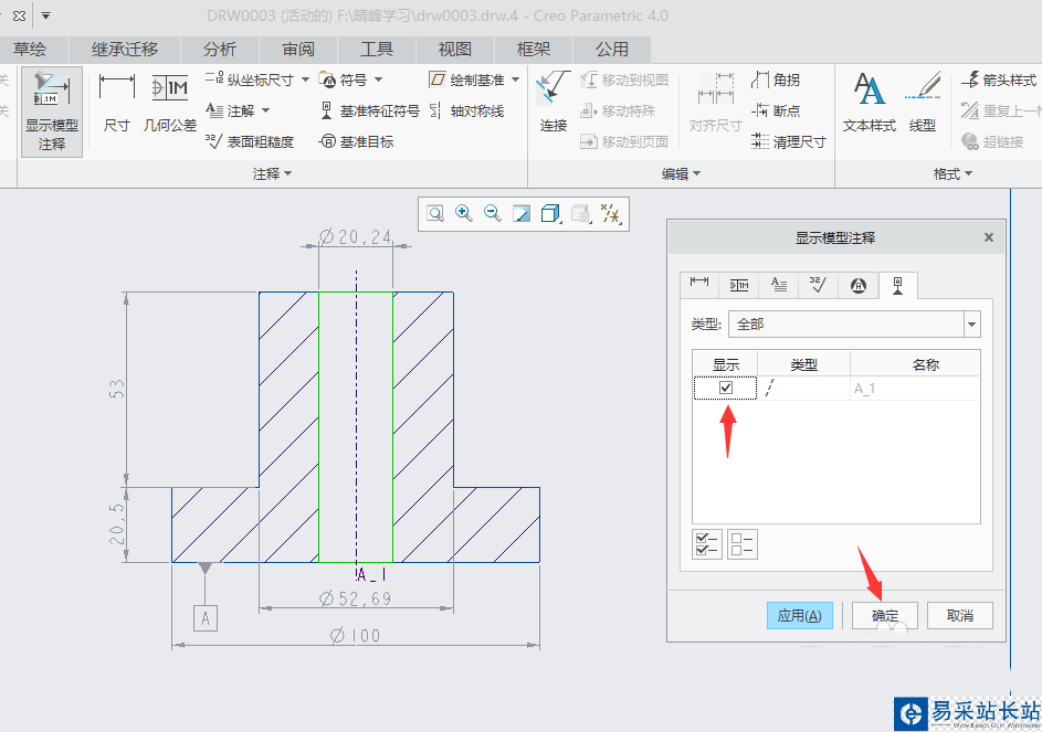 6、在“顯示模型注釋”對話框單擊A-1左邊顯示欄中的復(fù)選框,然后單擊顯示模型注釋”對話框中的“確定”。這樣就創(chuàng)建基準(zhǔn)軸了。