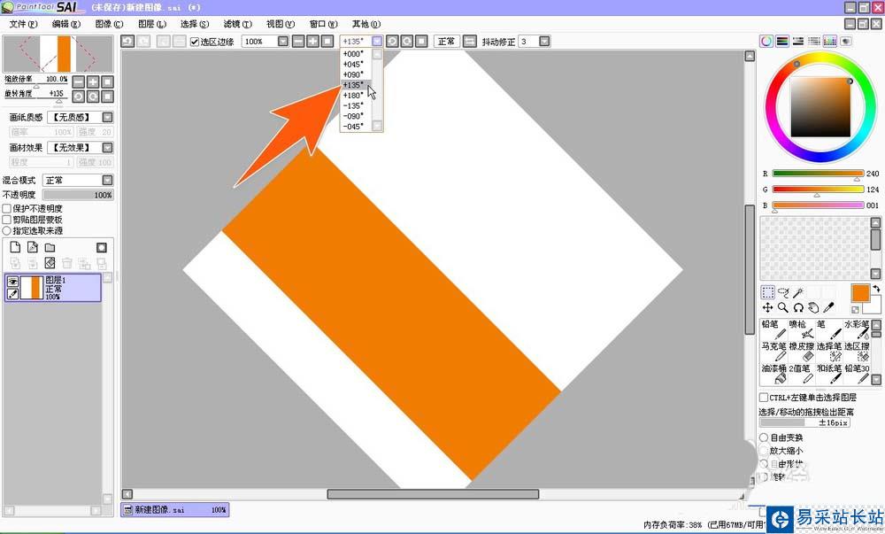 2、還可以直接在SAI中點擊上方的那個旋轉的角度,在彈出的下拉選項里面,有多種角度可以選擇,需要哪個就點哪個角度。