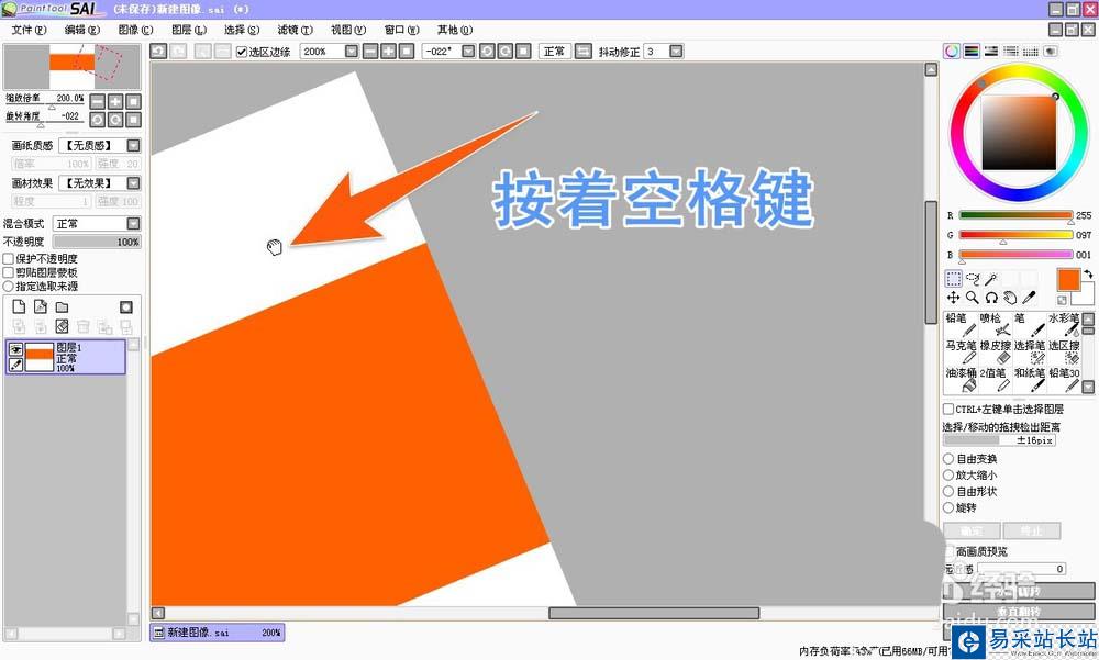 4、在SAI中,如果需要上下左右的移動畫布時,只要按著空格鍵不放,再按著鼠標左鍵,然后就可以自由的在sai中移動拖動畫布了。