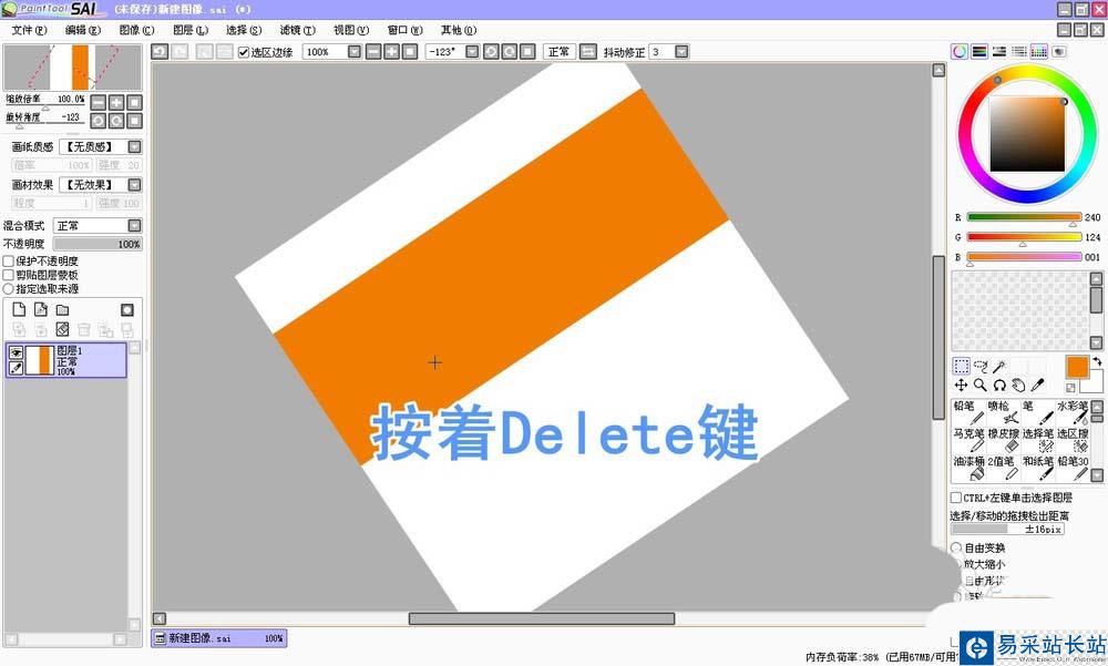 1、在sai中,可以按著Delete鍵不放,這時畫布就會自動開始旋轉,到了適合的角度時,只要松開Delete鍵就可以了。