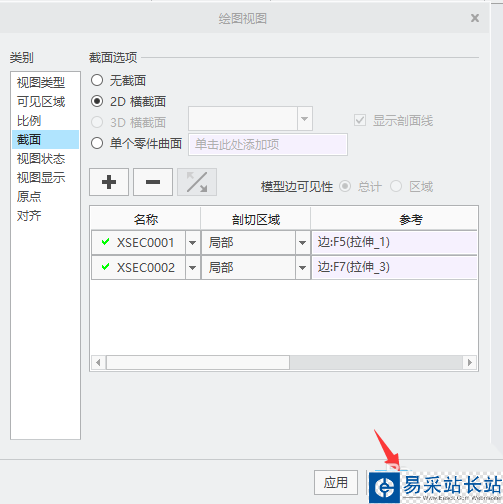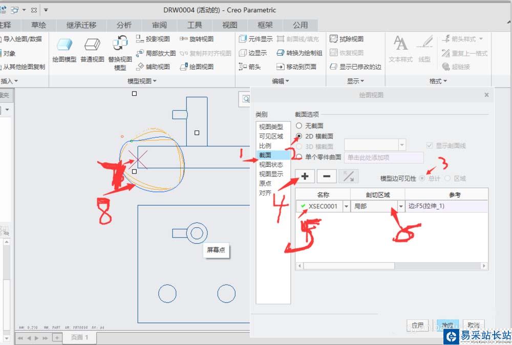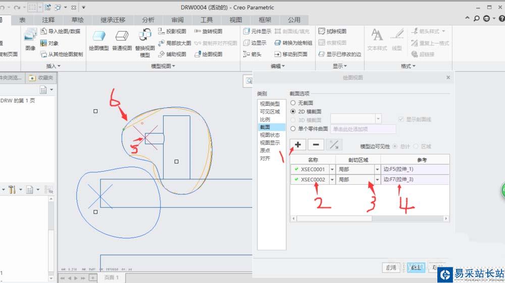 3、在彈出的“繪圖視圖”對話框中選取類別區域中的“截面”。截面選項中選取“2D橫截面”,將模型邊可見性設為”總計“。然后單擊”添加“按鈕。在名稱欄選取“XSEC0001”橫截面,剖切區域選擇“局部”。選取下圖中標記7參考點。繪制下圖標記8封閉樣條。
