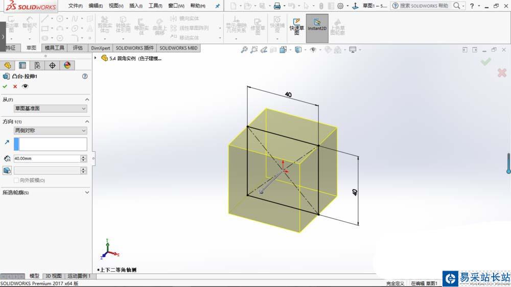 2、選定前視基準面,正視所選基準面,利用直線命令進行繪草圖,并設(shè)定相關(guān)尺寸。采用拉伸凸臺特征命令,點擊確定。