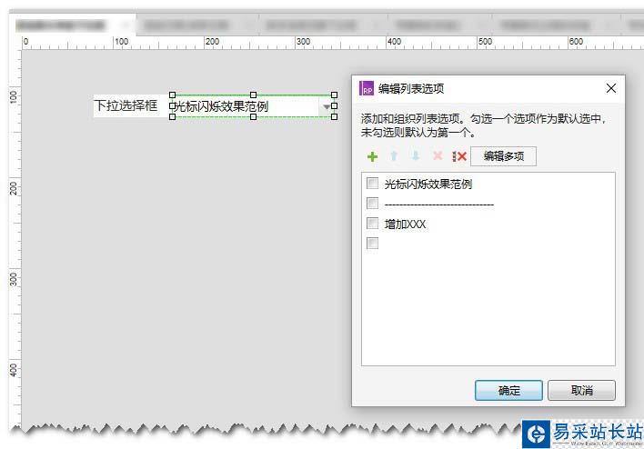 1、新建“標簽”和“下拉框”,下拉框的選項編輯,放4個選項:“光標閃爍效果范例”、“------------------------------”、“增加XXX”、“空格”,效果如下圖所示