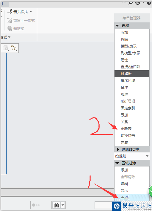 8、單擊”菜單管理器“對話框中區域過濾項中的“完成”。然后單擊”菜單管理器“對話框中“更新表”