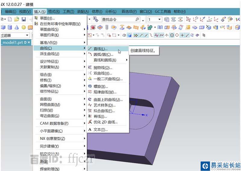 5、斜面的創建。以上的創建方法我們都常使用。下面進行斜面的創建,雖然最終也是通過拉伸,但其截面線的繪制就有點不同了。在這里選用建模中的插入--曲線來創建拉伸的截面線。